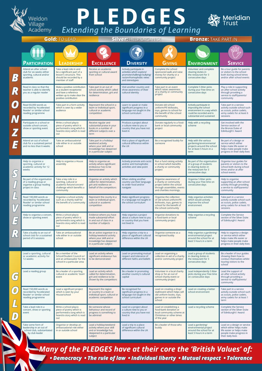 As part of Meridian Trust we believe in an all-round education where every child develops self-confidence, life skills and leadership experiences. PLEDGES is an awards system which offers students a range of character building opportunities that enhance their learning and development in order to support our challenging curriculum. Students are expected to complete their PLEDGES during their time at the academy, at Bronze, Silver and Gold levels:
