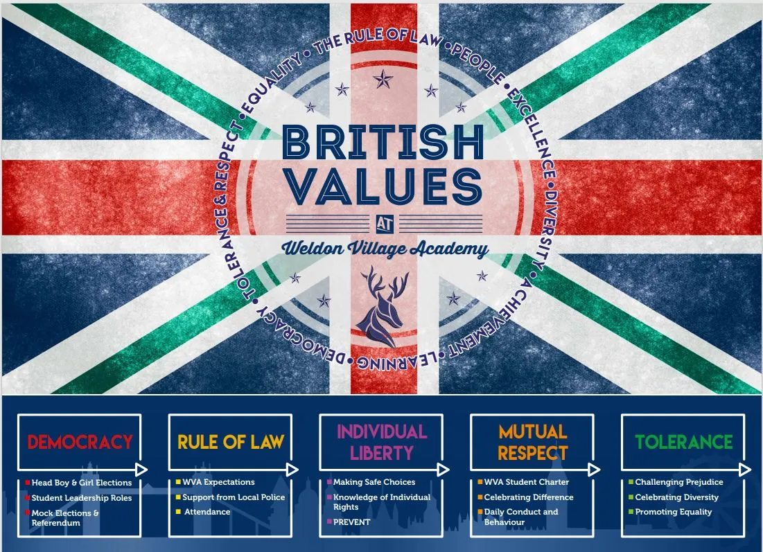 At the Weldon Village Academy these values will be taught explicitly through Values and Ethics and Religious Education. We will also teach British Values through planning and delivering a broad and balanced curriculum. The school takes opportunities to actively promote British Values through our assemblies and whole school systems and structures such as electing and running a successful Student Council. We also actively promote the British Values through ensuring our curriculum planning and delivery includes real opportunities for exploring these values. Actively promoting British Values also means challenging students, staff or parents expressing opinions contrary to fundamental British Values, including ‘extremist’ views.