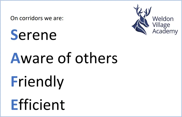 At Weldon Village Academy we wish to have a pleasant working atmosphere in which we all treat each other with care and respect, working towards shared goals. All staff and students behave in a SAFE way.